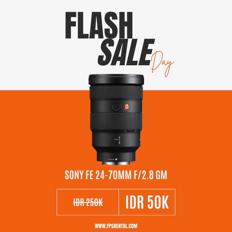 Sewa lensa Sony FE 24-70mm f/2.8 GM hanya Rp50.000 (normalnya Rp250.000)! 🎉
